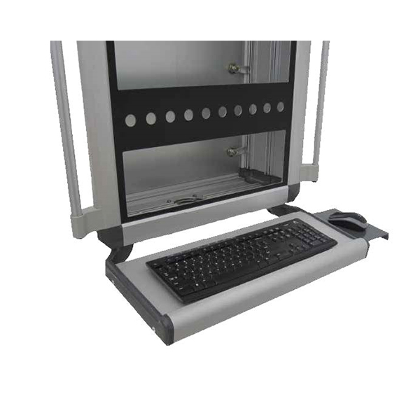 悬臂控制箱键盘托架专为放置键盘和鼠标而设计,采用中空铝型材,表面阳极氧化处理。两侧由铝合金压铸件与箱体连接。鼠标板位于右侧,可拉出或收起。